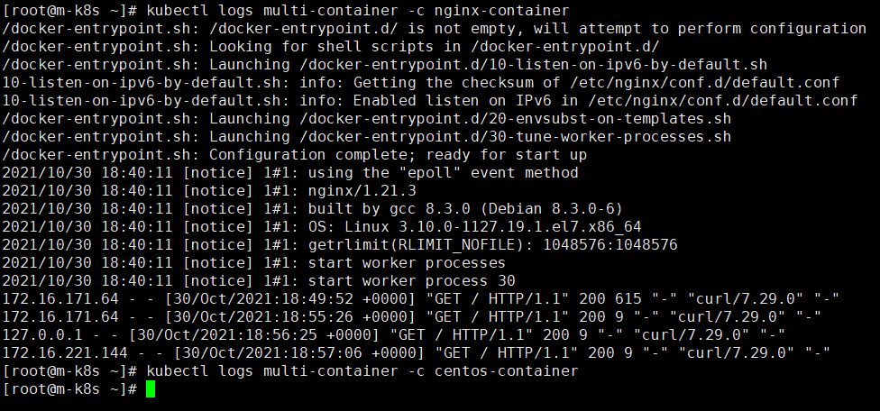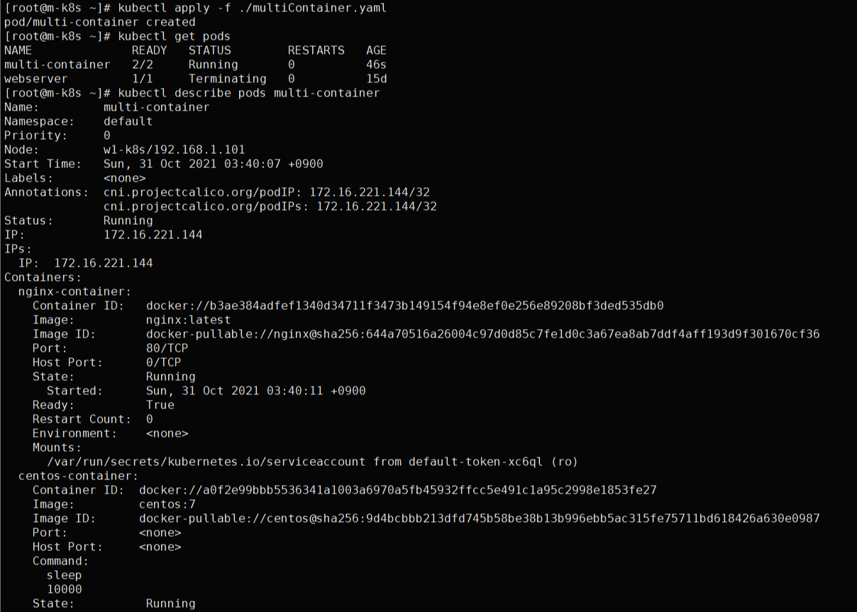 - nginx-container, centos-container 2 container가 1개의 pod에서 running중임을 확인