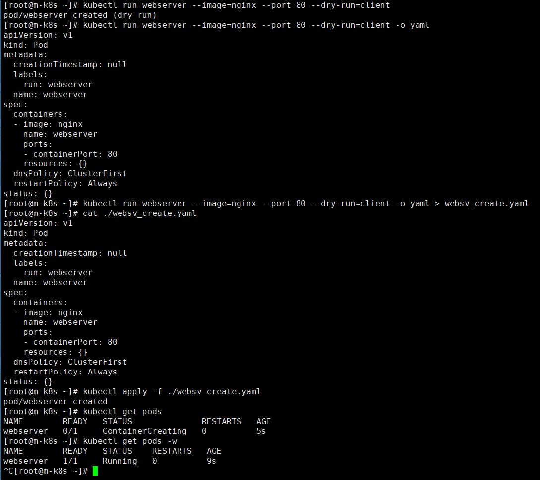 - # kubectl run webserver --image=nginx --port 80 --dry-run=client -o yaml > websv_create.yaml