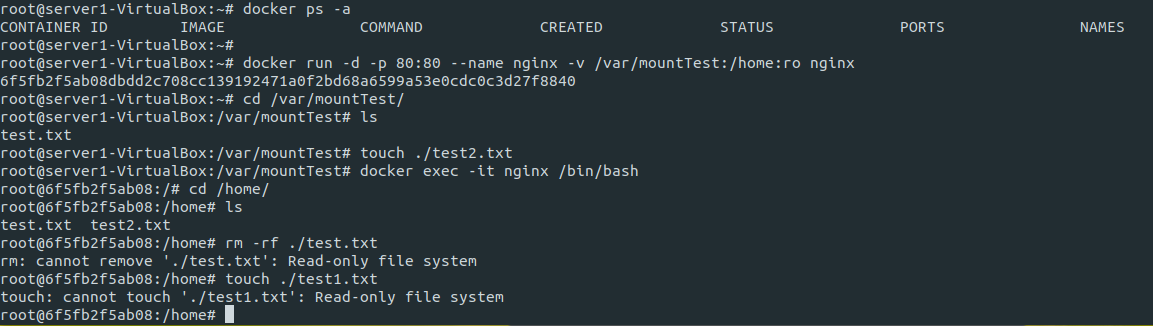 - # docker run -d -p 80:80 --name nginx -v /var/mountTest:/home:ro nginx